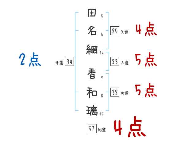 総運![]() | 田名網香和璃さんの総運は57画の4つ星!向上心があり人望がある。地位を得る。 あなたの人生を表す1番重要な運勢です。生涯を通じて影響する総合運となり、主に50歳以降の晩年期に影響を及ぼします。 |