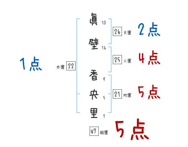 総運![]() | 眞壁香央里さんの総運は47画の5つ星!実力が開花し発展する円満な人生。財に恵まれる。 あなたの人生を表す1番重要な運勢です。生涯を通じて影響する総合運となり、主に50歳以降の晩年期に影響を及ぼします。 |