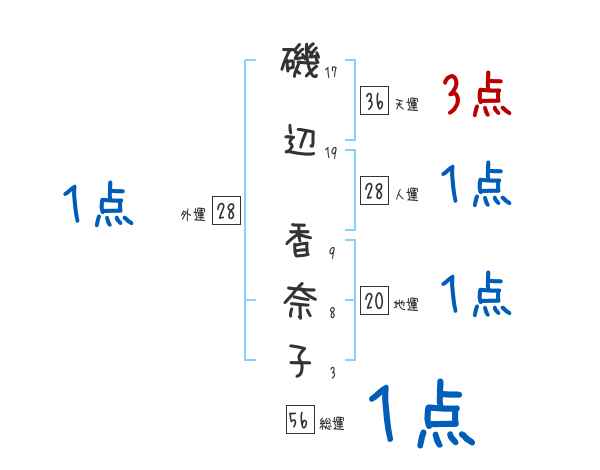 外運![]() | 磯辺香奈子さんの外運は28画の1つ星!家庭環境に注意。スポーツで活躍できる能力があるかも。 生活面を象徴する運勢です。外部から受ける影響力を表し、結婚運、家庭運や職場、環境への順応性を表します。 |