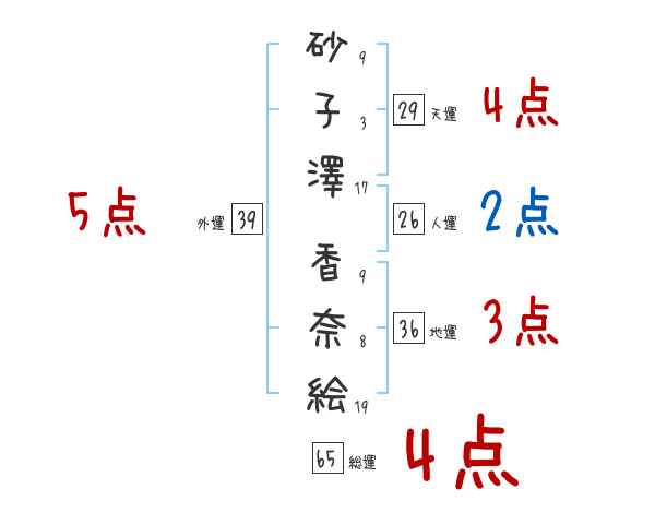 外運![]() | 砂子澤香奈絵さんの外運は39画の5つ星!社交性に優れ人望が厚い。人の上に立ち成功する。 生活面を象徴する運勢です。外部から受ける影響力を表し、結婚運、家庭運や職場、環境への順応性を表します。 |