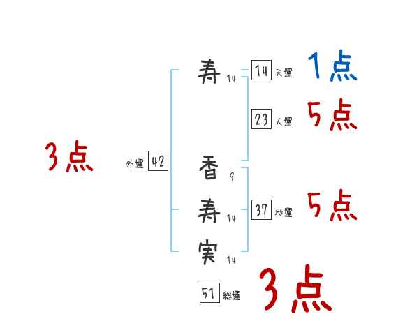 総運![]() | 寿香寿実さんの総運は51画の3つ星!変化が激しく、危険に注意。堅実な性格。 あなたの人生を表す1番重要な運勢です。生涯を通じて影響する総合運となり、主に50歳以降の晩年期に影響を及ぼします。 |