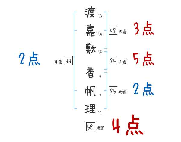 人運![]() | 渡嘉敷香帆理さんの人運は24画の5つ星!家庭運が良く順調な人生。金運にも恵まれる。 性格や才能などを表す2番目に重要な運勢です。人間関係や協調性、社会的な成功に影響します。主に20歳から50歳ぐらいまでの中年期の運勢を表します。 |