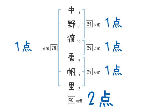 天運![]() | 中野渡香帆里さんの天運は28画の1つ星!家庭環境に注意。スポーツで活躍できる能力があるかも。 家系が持つ宿命的な運勢を表します。祖先から受け継いだ苗字ですので自分の力が及びません。家柄を象徴します。 |
