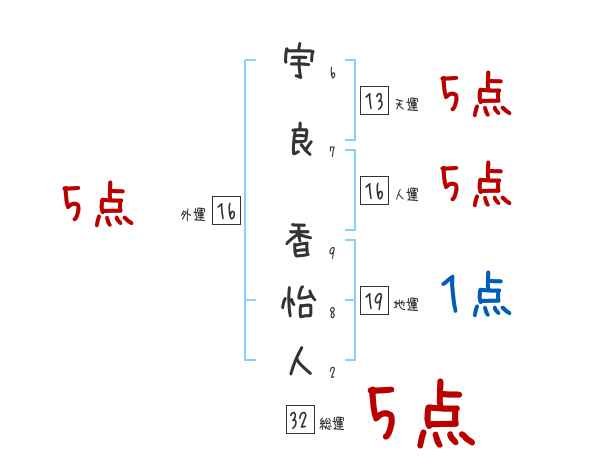 総運![]() | 宇良香怡人さんの総運は32画の5つ星!柔軟性があり成功する。チャンスが多く金運が良い。 あなたの人生を表す1番重要な運勢です。生涯を通じて影響する総合運となり、主に50歳以降の晩年期に影響を及ぼします。 |