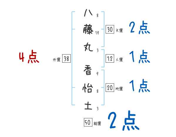 天運![]() | 八藤丸香怡土さんの天運は30画の2つ星!浮き沈みの激しさに注意しましょう。 家系が持つ宿命的な運勢を表します。祖先から受け継いだ苗字ですので自分の力が及びません。家柄を象徴します。 |