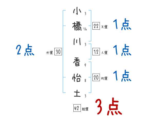 総運![]() | 小橋川香怡土さんの総運は42画の3つ星!病気に注意。多芸であるが消極的でおとなしい。 あなたの人生を表す1番重要な運勢です。生涯を通じて影響する総合運となり、主に50歳以降の晩年期に影響を及ぼします。 |