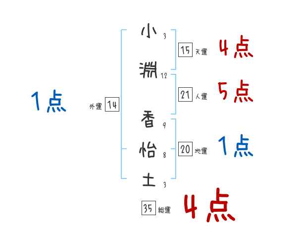 外運![]() | 小淵香怡土さんの外運は14画の1つ星!人に対して優しいがストレスを溜め込みがち。人間関係のトラブルを避けるよう気をつけましょう。 生活面を象徴する運勢です。外部から受ける影響力を表し、結婚運、家庭運や職場、環境への順応性を表します。 |