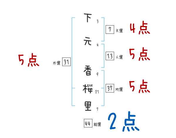 天運![]() | 下元香桜里さんの天運は7画の4つ星!強い意志や信念を持ち独立心が強い。自立する。 家系が持つ宿命的な運勢を表します。祖先から受け継いだ苗字ですので自分の力が及びません。家柄を象徴します。 |