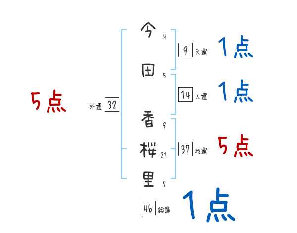 外運![]() | 今田香桜里さんの外運は32画の5つ星!柔軟性があり成功する。チャンスが多く金運が良い。 生活面を象徴する運勢です。外部から受ける影響力を表し、結婚運、家庭運や職場、環境への順応性を表します。 |