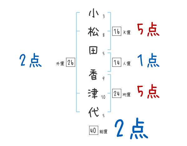 天運![]() | 小松田香津代さんの天運は16画の5つ星!人望が厚く大きく発展する。逆転成功が見える。 家系が持つ宿命的な運勢を表します。祖先から受け継いだ苗字ですので自分の力が及びません。家柄を象徴します。 |