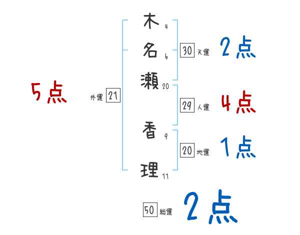 天運![]() | 木名瀬香理さんの天運は30画の2つ星!浮き沈みの激しさに注意しましょう。 家系が持つ宿命的な運勢を表します。祖先から受け継いだ苗字ですので自分の力が及びません。家柄を象徴します。 |