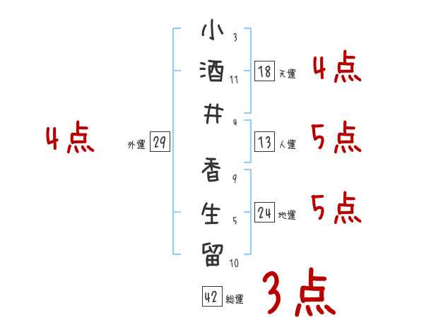 天運![]() | 小酒井香生留さんの天運は18画の4つ星!情熱的で剛気。忍耐力があり信頼される。 家系が持つ宿命的な運勢を表します。祖先から受け継いだ苗字ですので自分の力が及びません。家柄を象徴します。 |