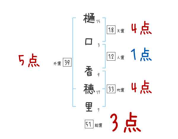 外運![]() | 樋口香穂里さんの外運は39画の5つ星!社交性に優れ人望が厚い。人の上に立ち成功する。 生活面を象徴する運勢です。外部から受ける影響力を表し、結婚運、家庭運や職場、環境への順応性を表します。 |
