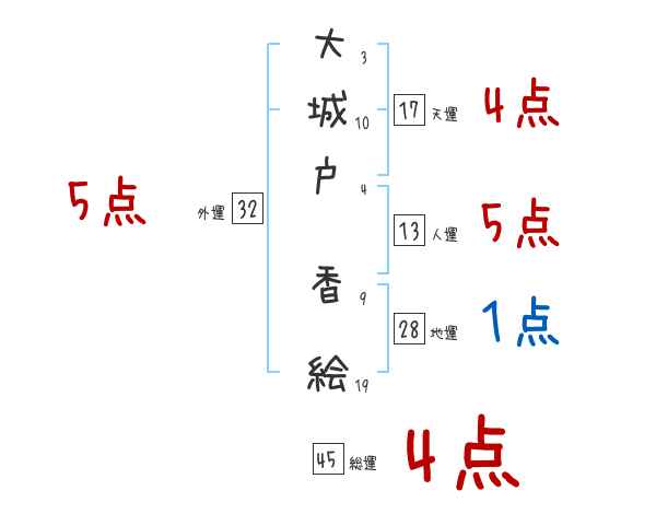 外運![]() | 大城戸香絵さんの外運は32画の5つ星!柔軟性があり成功する。チャンスが多く金運が良い。 生活面を象徴する運勢です。外部から受ける影響力を表し、結婚運、家庭運や職場、環境への順応性を表します。 |