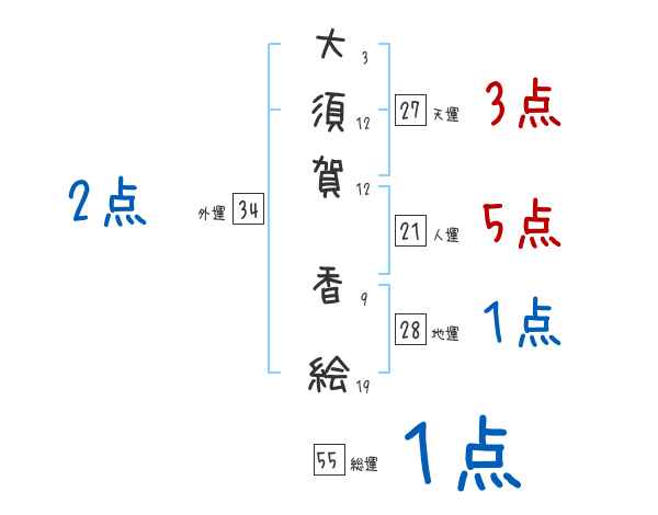 外運![]() | 大須賀香絵さんの外運は34画の2つ星!独創性に優れるが、自尊心が強く災難に注意しましょう。 生活面を象徴する運勢です。外部から受ける影響力を表し、結婚運、家庭運や職場、環境への順応性を表します。 |