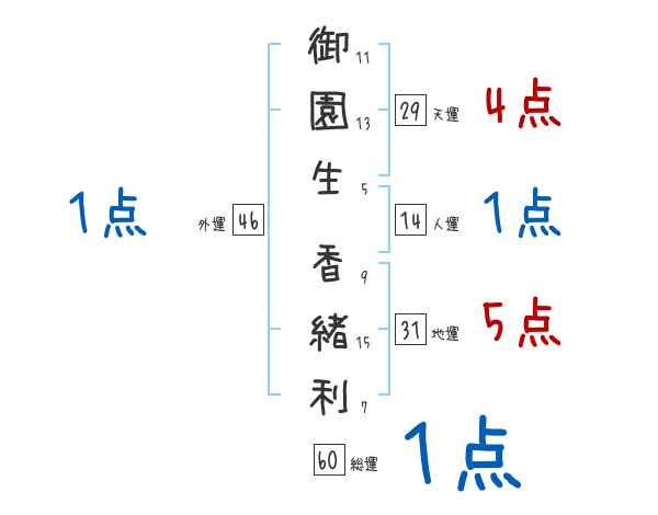天運![]() | 御園生香緒利さんの天運は29画の4つ星!完全主義で才能がある。厳格な心の持ち主。 家系が持つ宿命的な運勢を表します。祖先から受け継いだ苗字ですので自分の力が及びません。家柄を象徴します。 |