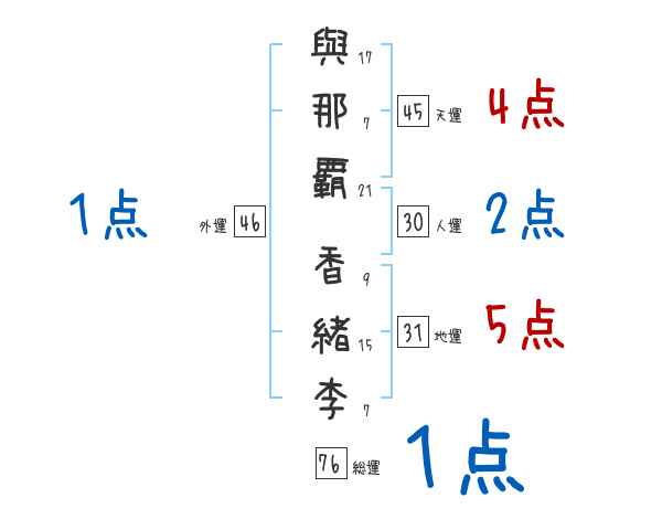 天運![]() | 與那覇香緒李さんの天運は45画の4つ星!もくもくと物事を進め達成する。地味な努力家。 家系が持つ宿命的な運勢を表します。祖先から受け継いだ苗字ですので自分の力が及びません。家柄を象徴します。 |