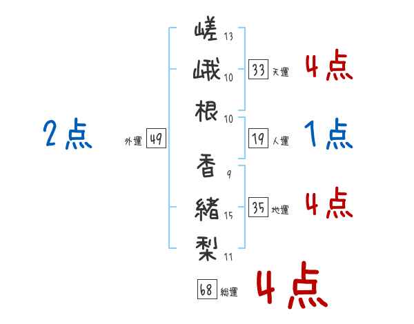 天運![]() | 嵯峨根香緒梨さんの天運は33画の4つ星!権力志向でプライドが高い。勇気があり運を切り開き成功する。 家系が持つ宿命的な運勢を表します。祖先から受け継いだ苗字ですので自分の力が及びません。家柄を象徴します。 |