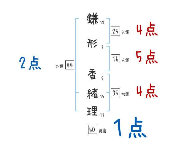 天運![]() | 鎌形香緒理さんの天運は25画の4つ星!個性があり才能があふれる。強運の持ち主で発展する。 家系が持つ宿命的な運勢を表します。祖先から受け継いだ苗字ですので自分の力が及びません。家柄を象徴します。 |
