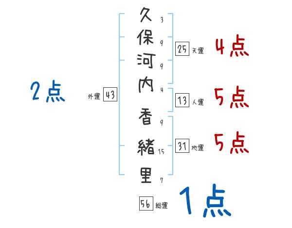 天運![]() | 久保河内香緒里さんの天運は25画の4つ星!個性があり才能があふれる。強運の持ち主で発展する。 家系が持つ宿命的な運勢を表します。祖先から受け継いだ苗字ですので自分の力が及びません。家柄を象徴します。 |