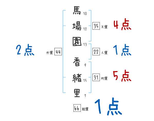 総運![]() | 馬場園香緒里さんの総運は66画の1つ星!迷うことが多く挫折しやすい傾向が。辛抱強く物事に取り組みましょう。 あなたの人生を表す1番重要な運勢です。生涯を通じて影響する総合運となり、主に50歳以降の晩年期に影響を及ぼします。 |
