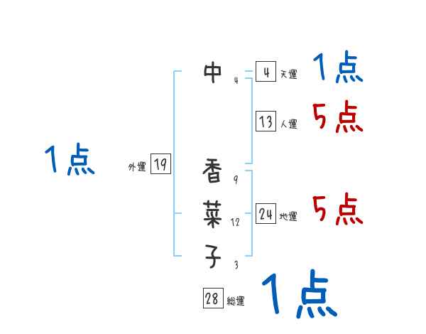 天運![]() | 中香菜子さんの天運は4画の1つ星!感情が不安定で苦労するかも。周囲との協調を心掛けましょう。 家系が持つ宿命的な運勢を表します。祖先から受け継いだ苗字ですので自分の力が及びません。家柄を象徴します。 |