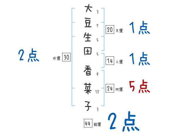 総運![]() | 大豆生田香菜子さんの総運は44画の2つ星!誠実で慎重な性格。物事を考えすぎないように注意しましょう。 あなたの人生を表す1番重要な運勢です。生涯を通じて影響する総合運となり、主に50歳以降の晩年期に影響を及ぼします。 |