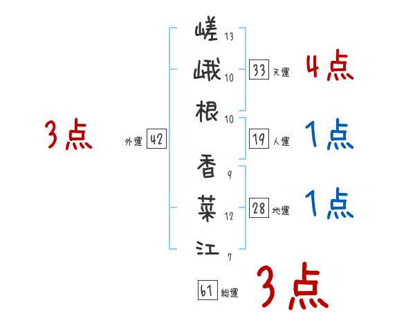 外運![]() | 嵯峨根香菜江さんの外運は42画の3つ星!病気に注意。多芸であるが消極的でおとなしい。 生活面を象徴する運勢です。外部から受ける影響力を表し、結婚運、家庭運や職場、環境への順応性を表します。 |