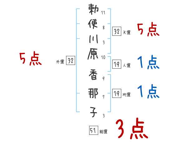 天運![]() | 勅使川原香那子さんの天運は32画の5つ星!柔軟性があり成功する。チャンスが多く金運が良い。 家系が持つ宿命的な運勢を表します。祖先から受け継いだ苗字ですので自分の力が及びません。家柄を象徴します。 |