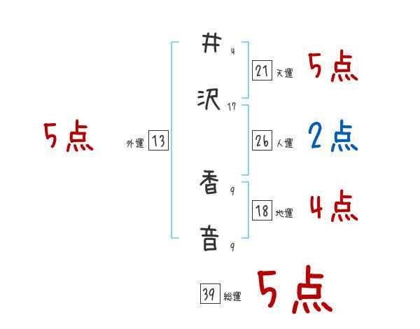 総運![]() | 井沢香音さんの総運は39画の5つ星!社交性に優れ人望が厚い。人の上に立ち成功する。 あなたの人生を表す1番重要な運勢です。生涯を通じて影響する総合運となり、主に50歳以降の晩年期に影響を及ぼします。 |