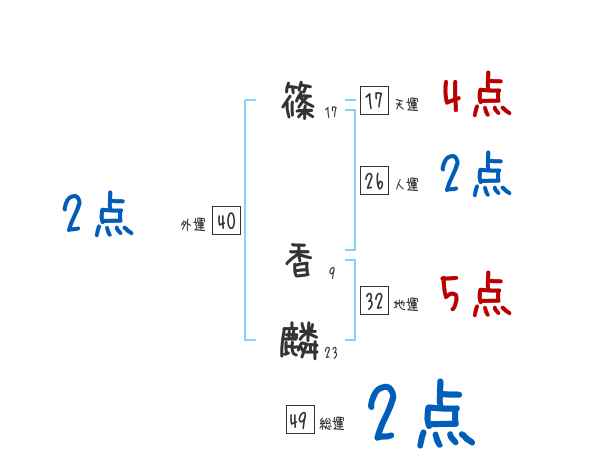 天運![]() | 篠香麟さんの天運は17画の4つ星!積極的な行動力。地位を気づき財産を手に入れる。純粋な心と直感力。 家系が持つ宿命的な運勢を表します。祖先から受け継いだ苗字ですので自分の力が及びません。家柄を象徴します。 |