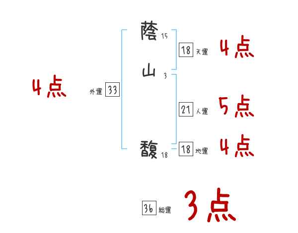 天運![]() | 蔭山馥さんの天運は18画の4つ星!情熱的で剛気。忍耐力があり信頼される。 家系が持つ宿命的な運勢を表します。祖先から受け継いだ苗字ですので自分の力が及びません。家柄を象徴します。 |