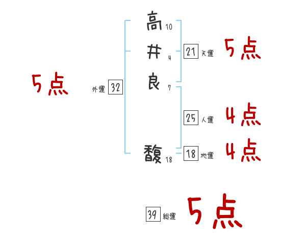 外運![]() | 高井良馥さんの外運は32画の5つ星!柔軟性があり成功する。チャンスが多く金運が良い。 生活面を象徴する運勢です。外部から受ける影響力を表し、結婚運、家庭運や職場、環境への順応性を表します。 |