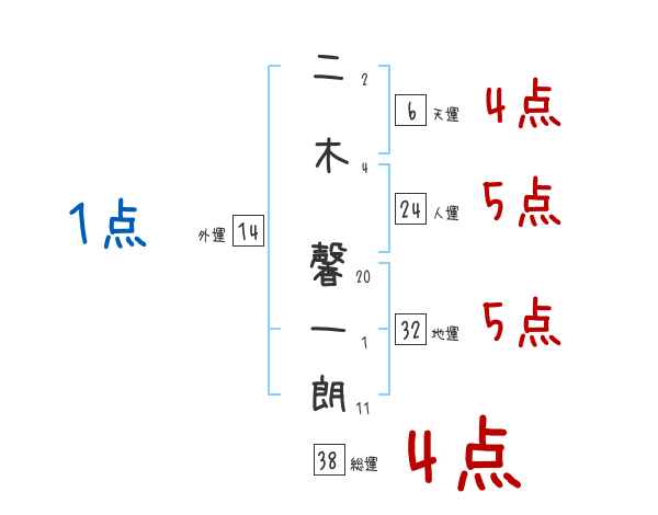 外運![]() | 二木馨一朗さんの外運は14画の1つ星!人に対して優しいがストレスを溜め込みがち。人間関係のトラブルを避けるよう気をつけましょう。 生活面を象徴する運勢です。外部から受ける影響力を表し、結婚運、家庭運や職場、環境への順応性を表します。 |
