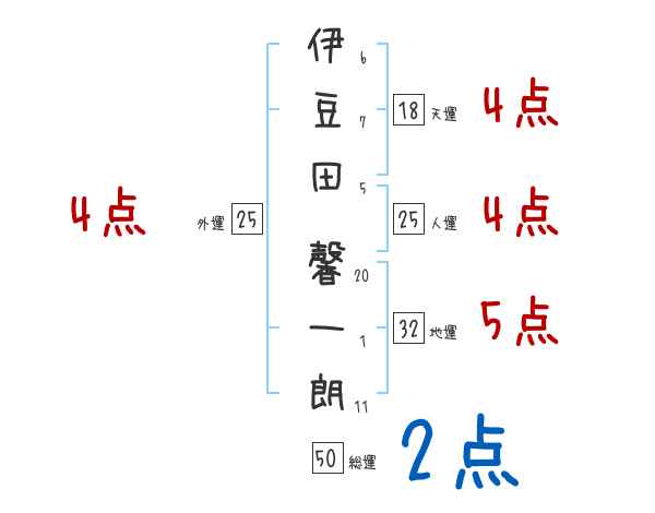 総運![]() | 伊豆田馨一朗さんの総運は50画の2つ星!浮き沈みが激しく不安定。しりすぼみに衰退しやすいので注意しましょう。 あなたの人生を表す1番重要な運勢です。生涯を通じて影響する総合運となり、主に50歳以降の晩年期に影響を及ぼします。 |