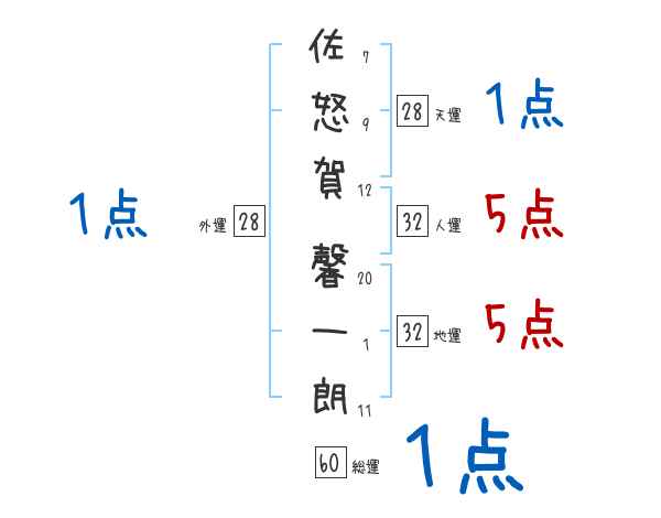 天運![]() | 佐怒賀馨一朗さんの天運は28画の1つ星!家庭環境に注意。スポーツで活躍できる能力があるかも。 家系が持つ宿命的な運勢を表します。祖先から受け継いだ苗字ですので自分の力が及びません。家柄を象徴します。 |