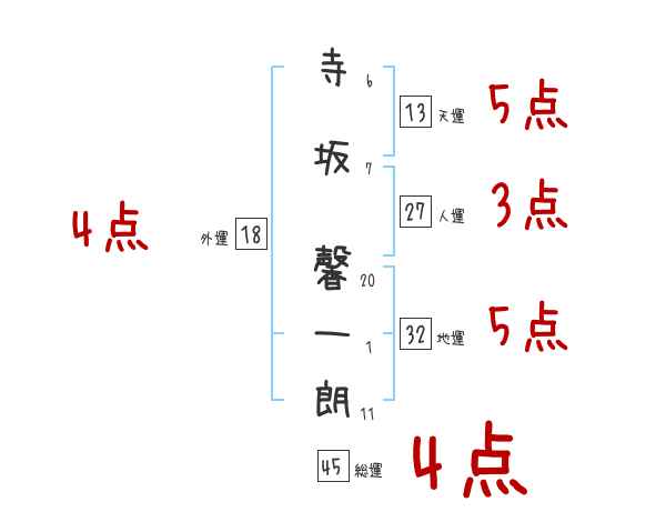 総運![]() | 寺坂馨一朗さんの総運は45画の4つ星!もくもくと物事を進め達成する。地味な努力家。 あなたの人生を表す1番重要な運勢です。生涯を通じて影響する総合運となり、主に50歳以降の晩年期に影響を及ぼします。 |