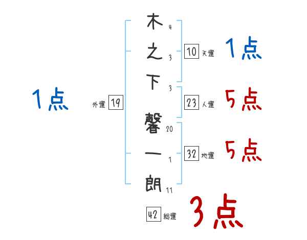 天運![]() | 木之下馨一朗さんの天運は10画の1つ星!不安を感じやすい傾向。ストレスを抱えないように注意しましょう。 家系が持つ宿命的な運勢を表します。祖先から受け継いだ苗字ですので自分の力が及びません。家柄を象徴します。 |