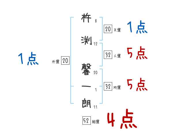 人運![]() | 杵渕馨一朗さんの人運は32画の5つ星!柔軟性があり成功する。チャンスが多く金運が良い。 性格や才能などを表す2番目に重要な運勢です。人間関係や協調性、社会的な成功に影響します。主に20歳から50歳ぐらいまでの中年期の運勢を表します。 |