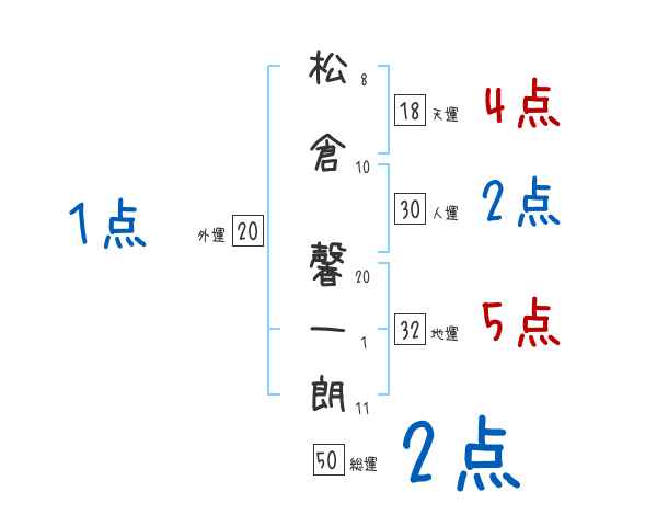 天運![]() | 松倉馨一朗さんの天運は18画の4つ星!情熱的で剛気。忍耐力があり信頼される。 家系が持つ宿命的な運勢を表します。祖先から受け継いだ苗字ですので自分の力が及びません。家柄を象徴します。 |