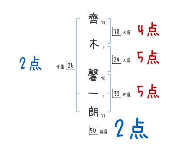 天運![]() | 齊木馨一朗さんの天運は18画の4つ星!情熱的で剛気。忍耐力があり信頼される。 家系が持つ宿命的な運勢を表します。祖先から受け継いだ苗字ですので自分の力が及びません。家柄を象徴します。 |
