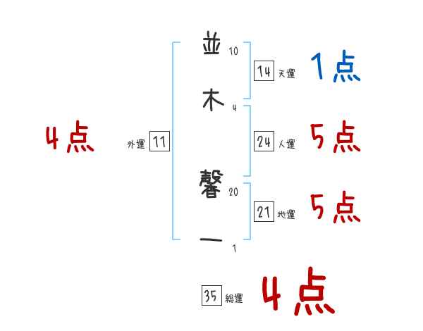 天運![]() | 並木馨一さんの天運は14画の1つ星!人に対して優しいがストレスを溜め込みがち。人間関係のトラブルを避けるよう気をつけましょう。 家系が持つ宿命的な運勢を表します。祖先から受け継いだ苗字ですので自分の力が及びません。家柄を象徴します。 |