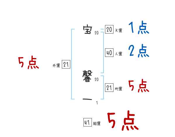 外運![]() | 宝馨一さんの外運は21画の5つ星!統率力がある。独立し成功する。名誉を手に入れる。 生活面を象徴する運勢です。外部から受ける影響力を表し、結婚運、家庭運や職場、環境への順応性を表します。 |