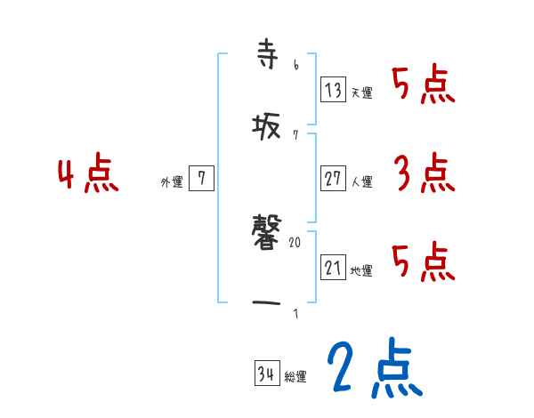 天運![]() | 寺坂馨一さんの天運は13画の5つ星!才能に恵まれ人気がある。名声を手に入れる。円満な人生。 家系が持つ宿命的な運勢を表します。祖先から受け継いだ苗字ですので自分の力が及びません。家柄を象徴します。 |
