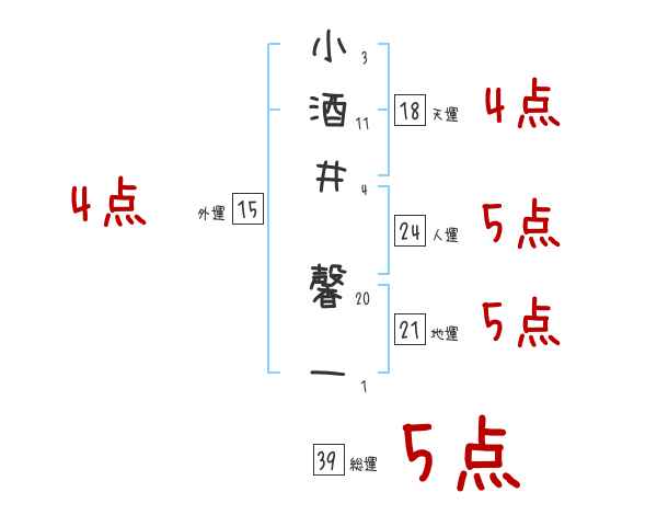 総運![]() | 小酒井馨一さんの総運は39画の5つ星!社交性に優れ人望が厚い。人の上に立ち成功する。 あなたの人生を表す1番重要な運勢です。生涯を通じて影響する総合運となり、主に50歳以降の晩年期に影響を及ぼします。 |