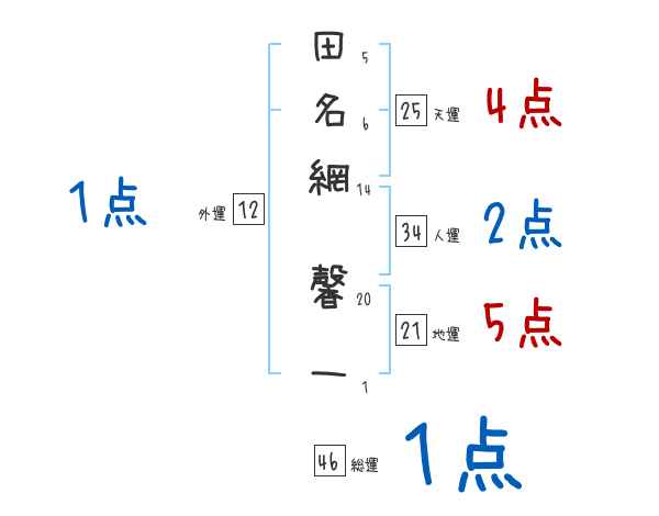 総運![]() | 田名網馨一さんの総運は46画の1つ星!迷走することが多く苦労するかも。目先のことにとらわれないように。 あなたの人生を表す1番重要な運勢です。生涯を通じて影響する総合運となり、主に50歳以降の晩年期に影響を及ぼします。 |