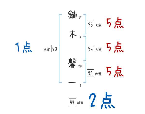 総運![]() | 鏑木馨一さんの総運は44画の2つ星!誠実で慎重な性格。物事を考えすぎないように注意しましょう。 あなたの人生を表す1番重要な運勢です。生涯を通じて影響する総合運となり、主に50歳以降の晩年期に影響を及ぼします。 |