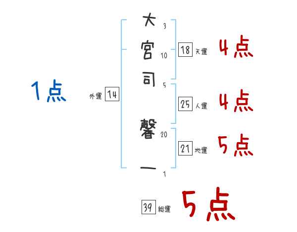 外運![]() | 大宮司馨一さんの外運は14画の1つ星!人に対して優しいがストレスを溜め込みがち。人間関係のトラブルを避けるよう気をつけましょう。 生活面を象徴する運勢です。外部から受ける影響力を表し、結婚運、家庭運や職場、環境への順応性を表します。 |