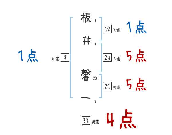 天運![]() | 板井馨一さんの天運は12画の1つ星!簡単な失敗で諦めてしまいやすいかも。着実に行動すると良いでしょう。 家系が持つ宿命的な運勢を表します。祖先から受け継いだ苗字ですので自分の力が及びません。家柄を象徴します。 |