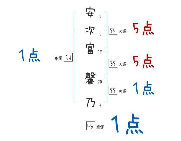 天運![]() | 安次富馨乃さんの天運は24画の5つ星!家庭運が良く順調な人生。金運にも恵まれる。 家系が持つ宿命的な運勢を表します。祖先から受け継いだ苗字ですので自分の力が及びません。家柄を象徴します。 |